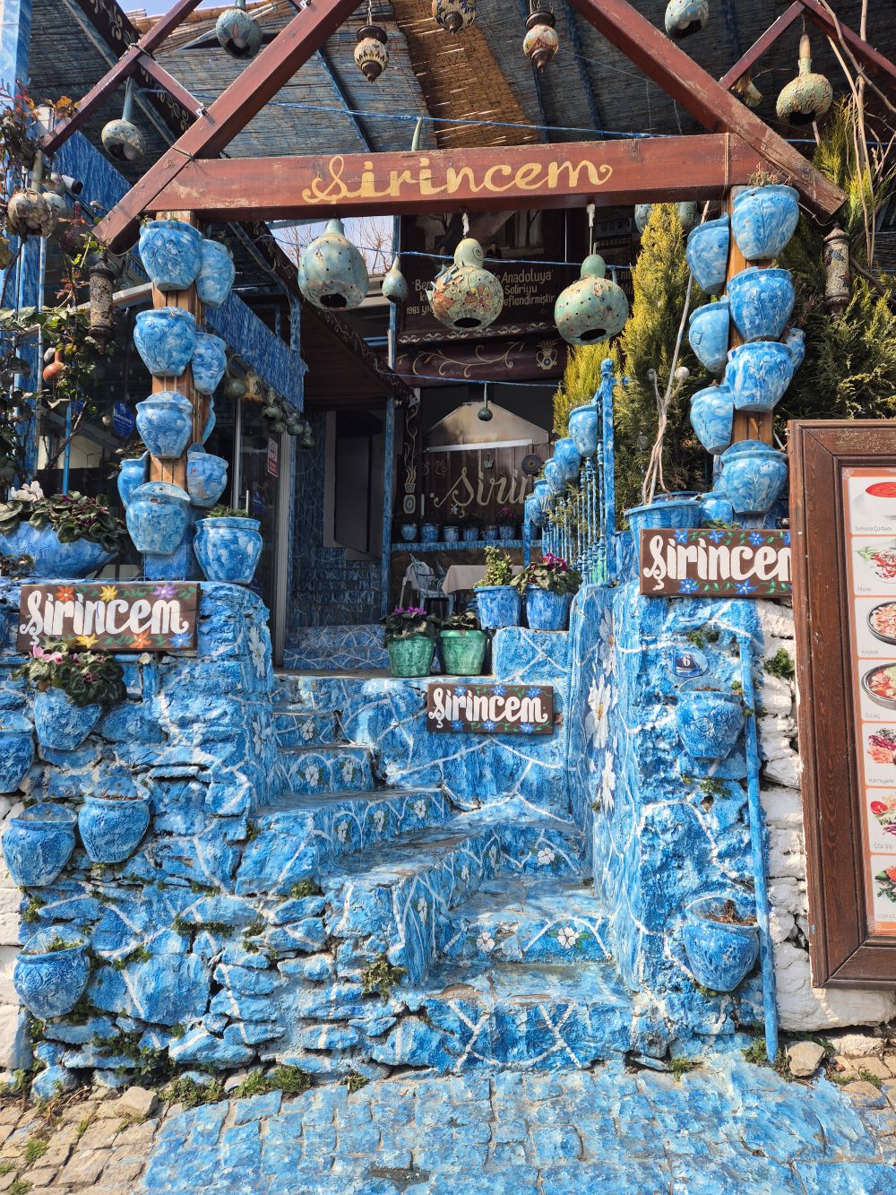 떠나는 날 시간 여유가 있어 셀주크에서 버스로 다녀올 수 있는 쉬린제를 다녀왔어요.(숙소 사장님께서 버스정류장 알려주셨고 작은 미니버스 같이 생겼는데 돌무쉬라고 하더라구요) 고즈넉한 풍경이 펼쳐지는 이곳은 와인이 유명한 곳이라고 하더라구요.  저 와인 잘 모릅니다. 단 거를 너무 좋아하는데 와인을 마실 때마다 떫은 맛이 강해서 좋아하지 않는데.... 쉬린제  이곳 그런 제가 와인을 3병이나 사게 만든 곳이에요. 저희를 보자마자 '안녕하세요 와인 먹고 가세요' 하신 가게에 들어가서 시음 했는데 한국말은 왜 이렇게 잘하시는지ㅋㅋㅋㅋ '오디와인, 머루와인, 체리와인, 블루베리와인, 석류와인' 거의 랩처럼 이야기하셔서 놀랐어요ㅋㅋㅋㅋ 오디와인, 머루와인 시음해보고 표정이 애매하자 사장님께서 어떤 와인 좋아해요? 단 거?라고 물어보셔서 고개를 끄덕이자 어떤 와인(세 번째 특이한 그림 그려져있는 와인도 맛있었는데 결론적으론 다른 와인을 사서 무슨 맛이었는지 기억이 안나요...ㅠ)과 메론와인을 맛보게해주셧는데 네... 사버렸습니다 메론와인ㅋㅋㅋㅋㅋ 와인에서 이런 맛있는 과일 맛이 날 수 있는지 처음 알았어요.(지금 집에 고이 모셔져 있습니다 한국에선 아무리 검색해도 안 나와서 남편이랑 아껴먹기로 했어요ㅋㅋㅋ) 그렇게 복숭아와인, 메론와인, 수박리큐르를 사서 왔습니다ㅋㅋㅋㅋㅋ