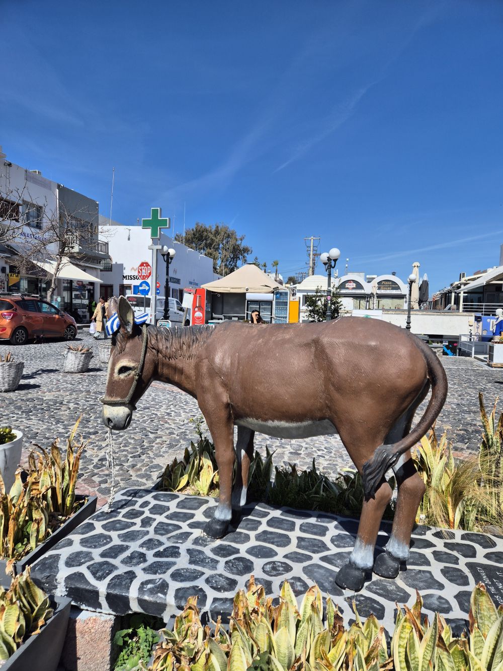 피라마을도 다녀왔어요. 3월초 산토리니는 성수기가 아니라 관광객이 많이 없고 문을 연 식당이나 상점들이 많이 없었어요. 그래서 저희 부부는 더 좋았던 것 같아요. 가보고 싶었던 산토리니를 고즈넉하게 즐길 수 있었거든요. 식당들이 문을 많이 열진 않았지만 아예 열지 않은 건 아니라 맛있는 음식도 많이 먹었고, 상점도 아예 문을 열지 않은 건 아니라 저희가 원하는 기념품들도 구매할 수 있었어요. 천천히 피라마을도 즐기고 왔답니다. 피라 세 개의 종도 천천히 보고 사진찍고 왔구요. 당나귀 조형물도 봤어요. 가파른 언덕과 계단이 많은 산토리니 특성상 당나귀가 짐과 사람을 날랐다고 해요. 피라에는 동키택시가 있다고해요. 실제로 이아마을에서 오픈준비중인 숙소에서 당나귀를 이용해 짐을 나르는 걸 볼 수 있었어요.